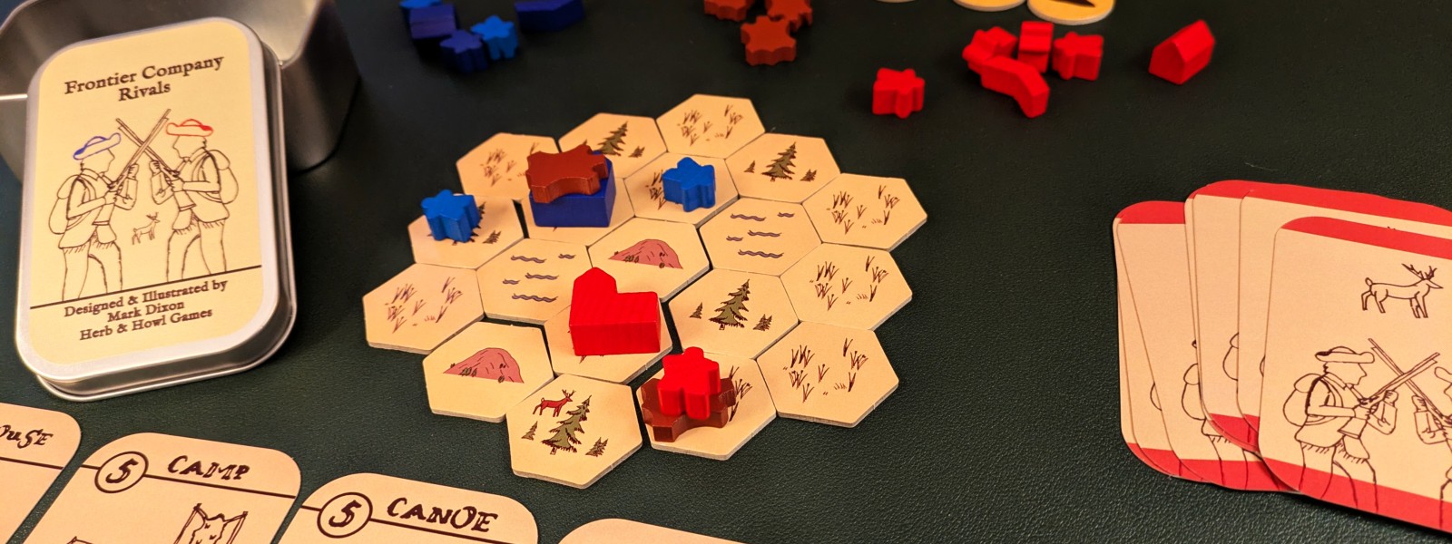 A modular hex tile system means no two games play alike. Hunting grounds shift. River crossings change. The frontier refuses to be tamed — or memorized.