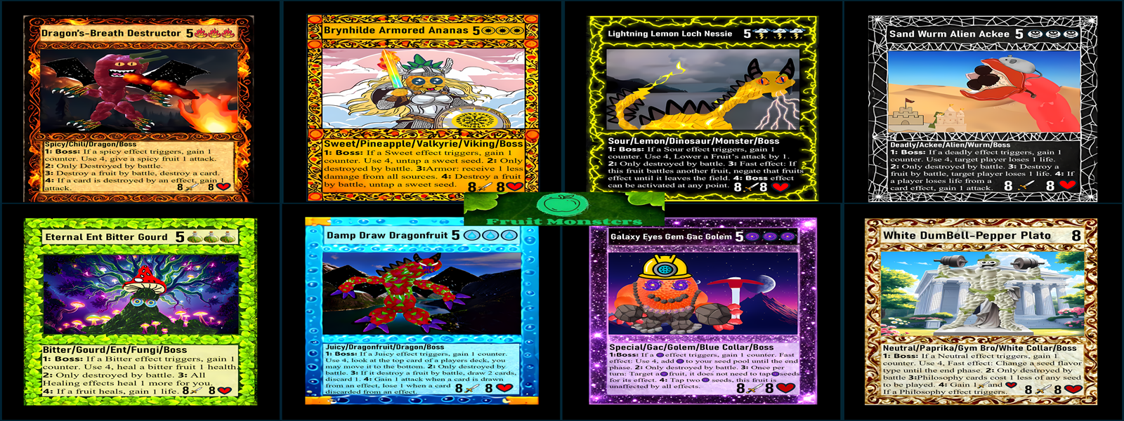 This is a trading card game about Fruit Monsters. You play as a fruit farmer, battling against the enemy fruit farmer. the goal is to reduce the enemy's life from 20 to 0.You have 2 decks. 1 Fruit deck and 1 seed deck. There are 50 cards in the Fruit Deck and 15 cards in the seed deck. you start by drawing 6 fruit deck cards, then every turn after you can draw 2 cards during your draw phase. you either draw 1 fruit deck and seed card or 2 fruit cards or 2 seed deck cards. You can play 1 seed card per turn. you tap seed cards in order to play other cards.