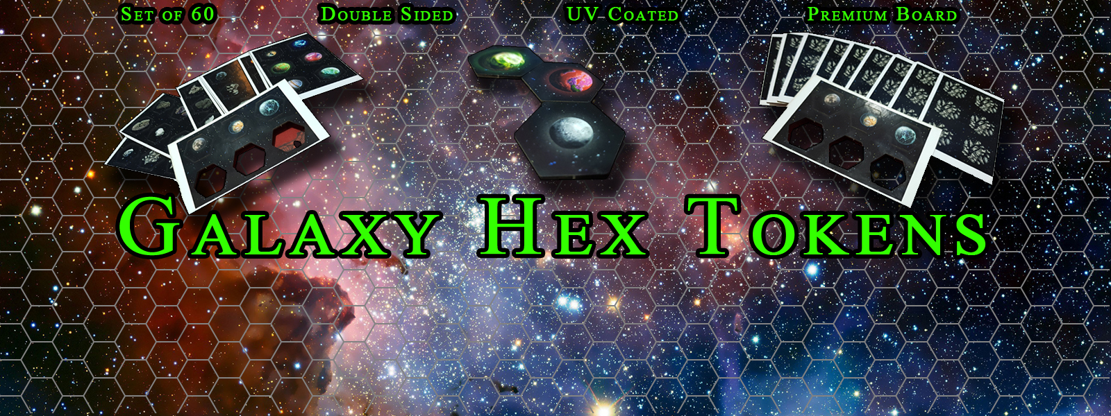 60 Double sided hex tokens for use during your epic space battles. Whether running from the corporations or staging full scale fleet combat, it's always better to have cover. This hex set includes planets, asteroids, wormholes, and meteors... everything an ace pilot needs to our run and out maneuver the enemy.