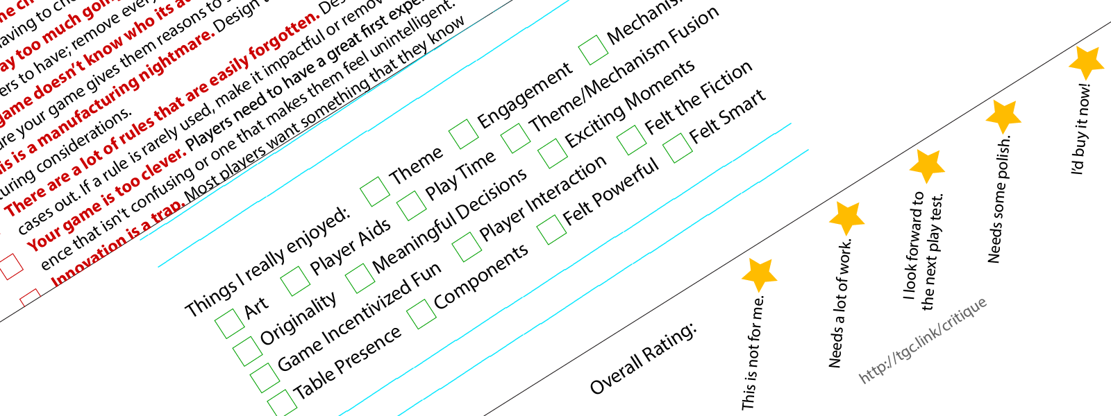 It includes quick check boxes to easily articulate the things that are holding back a game's design. It also has a feedback form to leave more detailed feedback including the great things about the game.