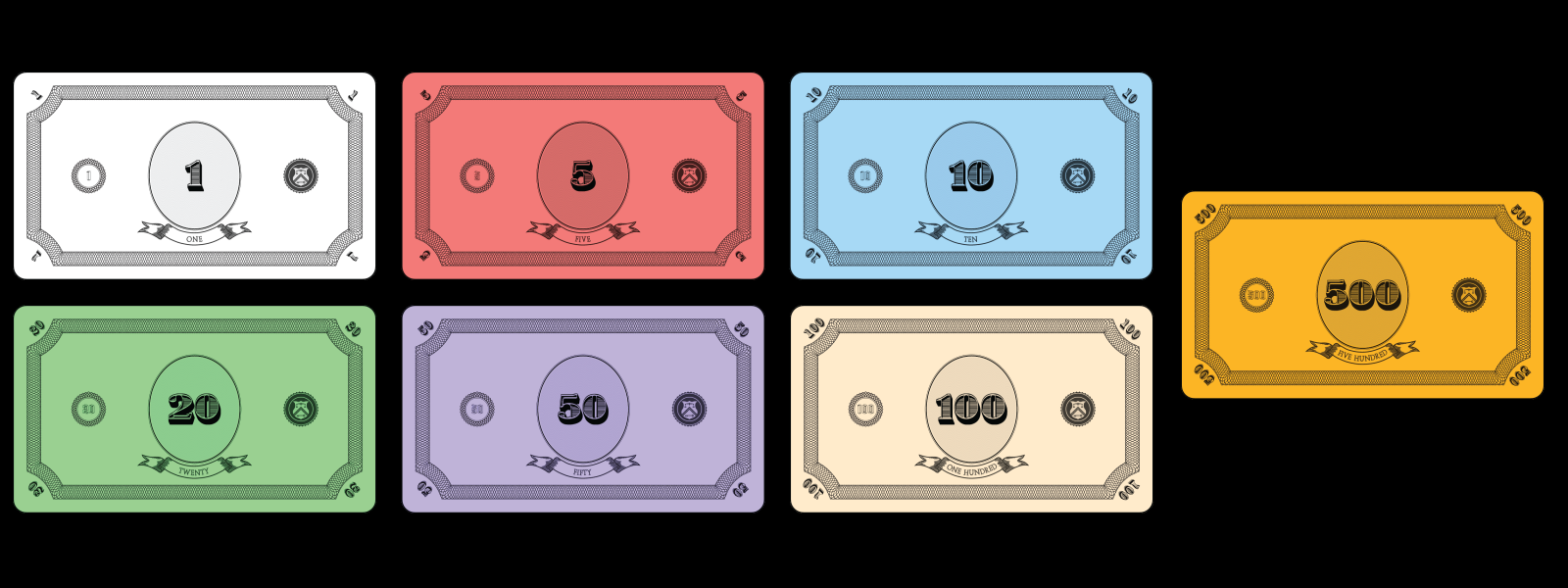 The colors and denominations of the cards were specifically chosen to mimic those of a certain popular boardgame. Yet, they can be used with any game as they do not contain symbols or words which specify a certain currency.