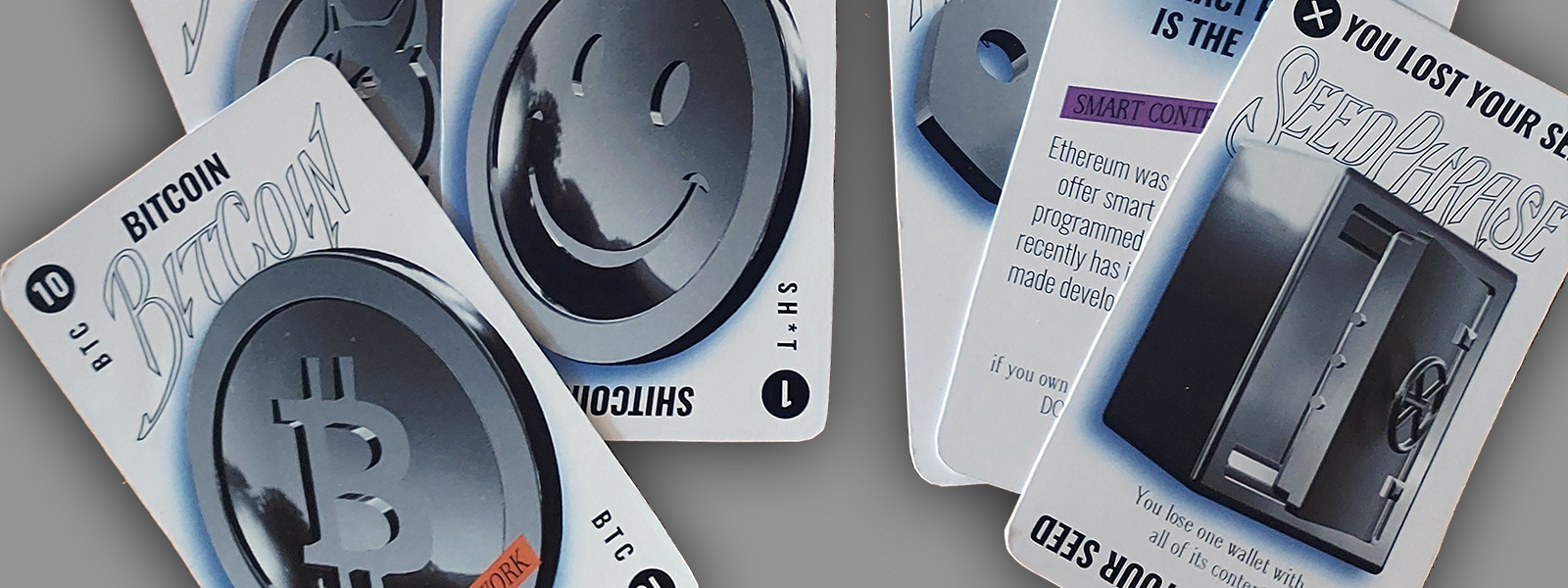 GetCrypto es un juego de cartas que utiliza dos tipos de cartas: cartas de moneda y cartas de evento. Los jugadores comienzan con una cantidad determinada de cartas de moneda y se turnan para jugar cartas de evento para robar nuevas cartas de moneda, protegerlas en un monedero o hacer que otros jugadores pierdan monedas.