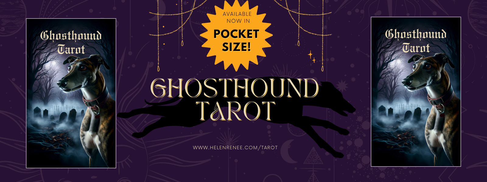 Introducing Ghosthound Pocket Tarot, inspired by the legendary ghosthunting greyhound, Bond. Bond's unmatched skills in paranormal investigations now transcend the earthly realm, offering his expertise in tarot readings from “beyond the bark”. Embracing the Rider-Waite tradition, Ghosthound Tarot infuses a delightful twist with canine companions, adding a touch of whimsy to your spiritual journey. Explore the mysterious realms of the unseen with Bond's guidance, as his legacy lives on through these uniquely crafted cards. Let Ghosthound Tarot unleash the power of intuition and insight, guided by the spirit of the extraordinary hound Traditional 78 card deck with one information card and photo cover card included. Ghosthound Pocket Tarot are the same images as Ghosthound Tarot, just travel size so take them anywhere! The face of the cards have a paw print border around the edge. The companion books for Ghosthound Tarot by Helen Renèe Wuorio and Brian Sterling-Vete are “Tarot” and “Tarot Card Spreads” both available on Amazon. Ghosthound Tarot is created by Tarot Master Helen Renèe Wuorio and Paranormal Researcher Brian Sterling-Vete PhD also known as Bond’s human “pawrents”.
