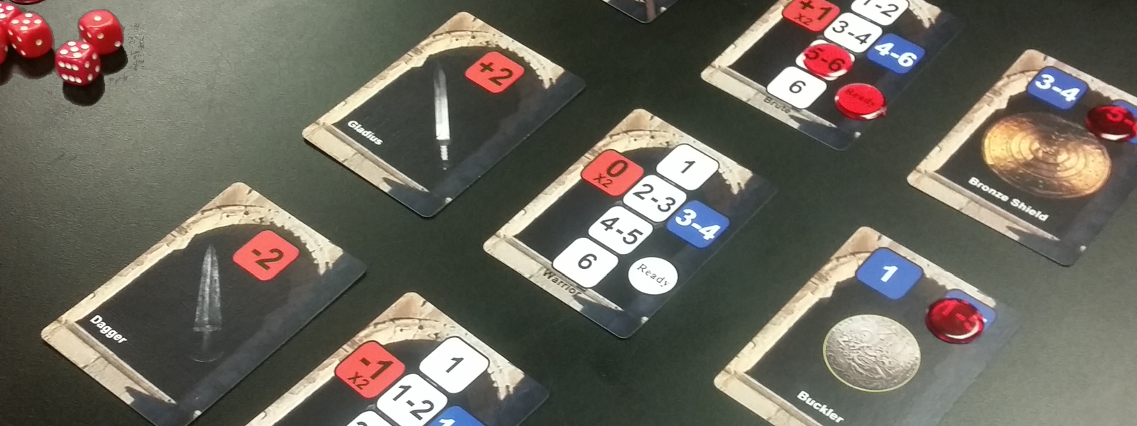 Gladiators is a game of PVP dice placement. Every round you can switch out a weapon, switch out a shield and attack as many enemies as you can. Some weapons work better against different shields and defenses. Some weapons bypass all those defenses but leave you open to attack. The strategy is to figure out when to best use every card you have.