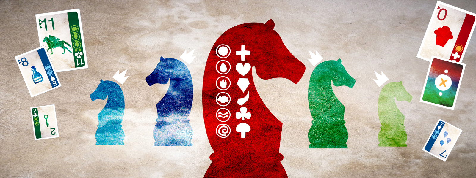 Two full sets of six suits (EARTH, FIRE, WATER, AIR, MAGIC, and ALCHEMY), numbered 2-9 plus the additional classes ACE, APPRENTICE, MAGICIAN, and WIZARD. These suits come 1, 2, or 3 to a card, making for interesting gameplay decisions.
