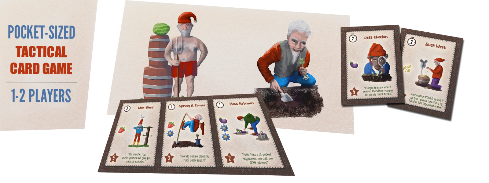 Gnomadic Gardeners is a pocket-sized engine-builder for 1-2 players. Deploy gnomes and recruit enchanted animal assistants to complete tasks at the community garden. But plan ahead: Gnomes are "gnome-torious" for their free spirits, and any that you use will join your opponent's hand for the next round!