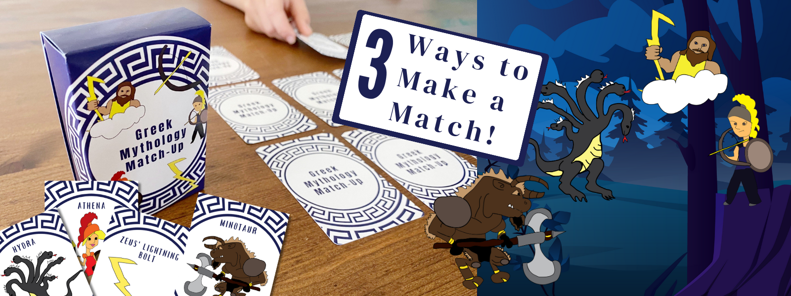 One day, My kids, Lucas and Tydus were listening to the famous Percy Jackson book series. The tale of Percy fighting the Minotaur inspired Lucas to try drawing the mythical creature. After drawing the Minotaur, the boys thought it would be fun to make a few more Greek Gods and monsters so they could make their own matching game. They worked together to draw each character and weapon, and Mom helped turn them into a card game. We hope you enjoy playing this exciting Greek Mythology Matching Game as much as we do!