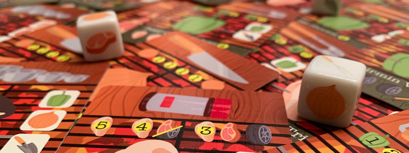 In Grillbillies, you play as a hillbilly preparing and grilling kebabs! Discard kitchen cards to SWAP, FLIP, PREP, SHAKE and SAUCE ingredient dice. Take turns drafting dice and playing cards from your hand to grill a kebab of 8 ingredients. Complete Mema's recipes to score additional points each round! Secretly work to advance your hidden ingredient to gain extra points and prove your ingredient makes the best kebabs! The player with the most points after 3 rounds is the winner!