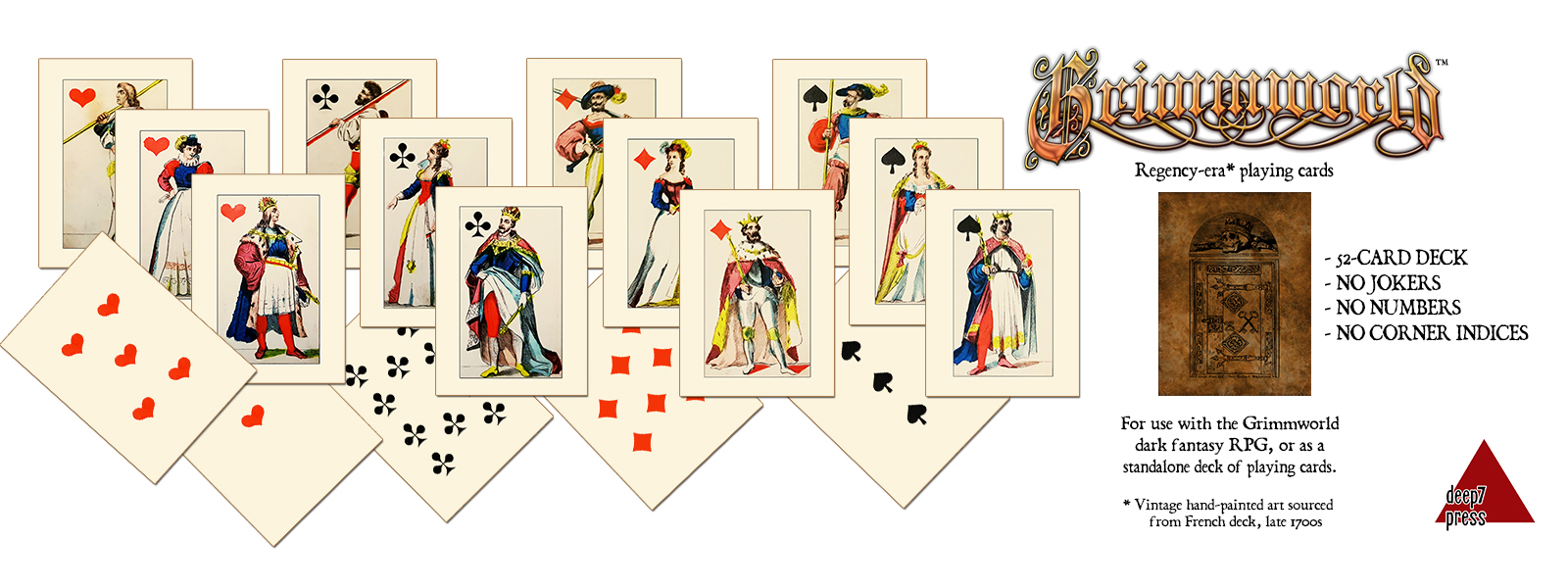For our Regency-era dark fantasy RPG, Grimmworld, we wanted a deck of playing cards that resembled cards of the era, but with modern trim and coating for durability. We couldn't find a Regency-era replica deck on the market that wasn't merely printed on uncoated card stock, so we sourced vintage French art from the late 1700s and put together this deck for all your Regency-era gaming needs. Although not suitable as an historically-accurate film prop (due to the UV coating and decorative back), this deck is otherwise faithful to the art and layout of the day.