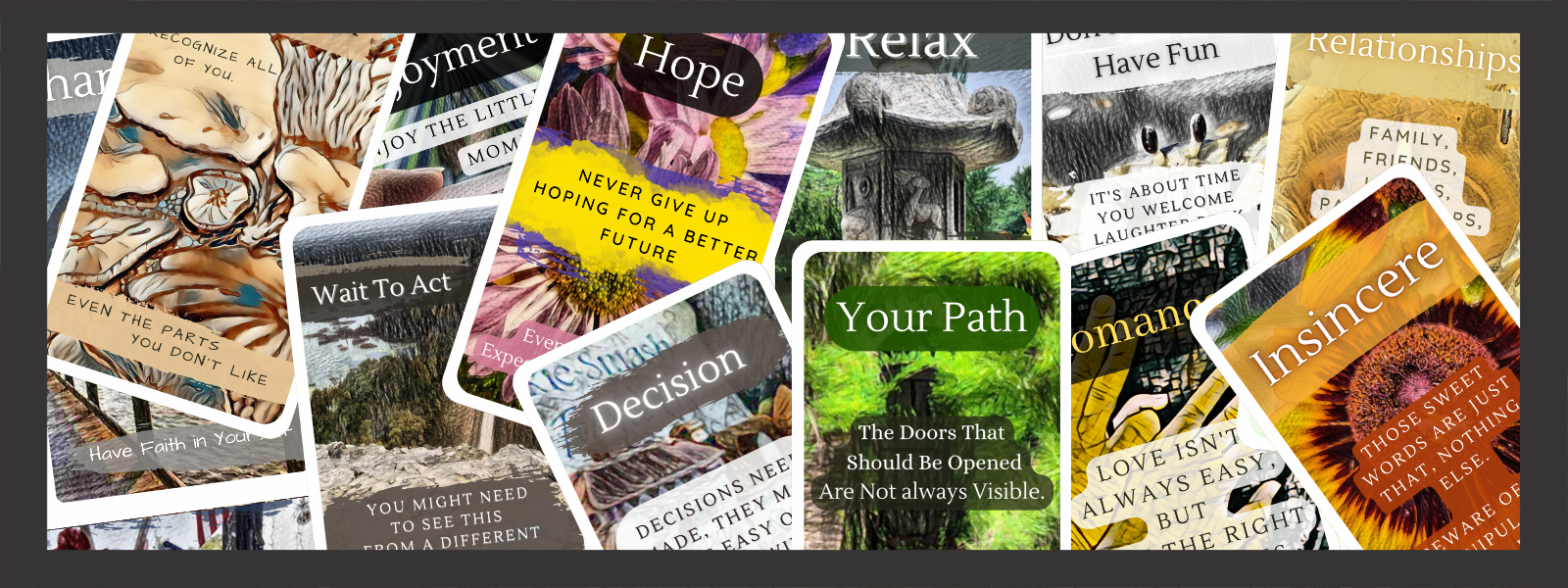 Dive into Guiding Word, a unique oracle card deck featuring 54 cards with original photography and inspiring phrases. Each card offers a visual and thematic element designed to guide, challenge, and illuminate. Perfect for personal reflection, group play, or as a tool for professional readings, this game blends art and intuition to create an engaging experience. Discover how each card can spark new ideas and deepen your understanding of the world around you.This is the mini verison of the orginal. That way you can take it anywhere with you.