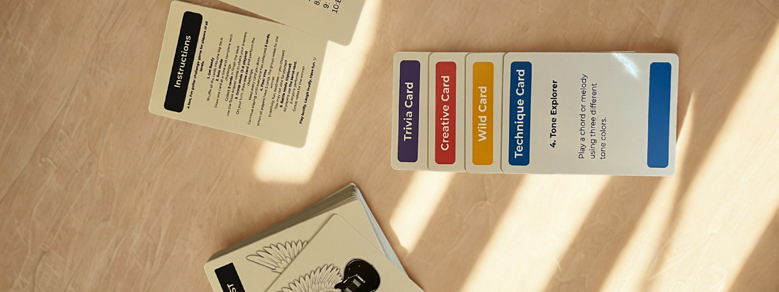 Guitar Quest is a card game designed for guitar players of all levels—from beginners to advanced musicians—who want to improve their skills, spark creativity, and enjoy their practice time. The game features a variety of card types that challenge players in different ways: technique, musical knowledge, creative exploration, and playful surprises. Players can draw cards during lessons, individual practice sessions, or group settings to introduce new goals, break routines, and approach the guitar from fresh perspectives. Guitar Quest encourages thoughtful practice, curiosity, and flexibility. It can be used as a short warm-up, a focused practice challenge, or a fun activity that supports musical growth while keeping learning engaging and enjoyable. Whether used by teachers in the studio or by players at home, Guitar Quest transforms practice into an interactive and motivating experience.