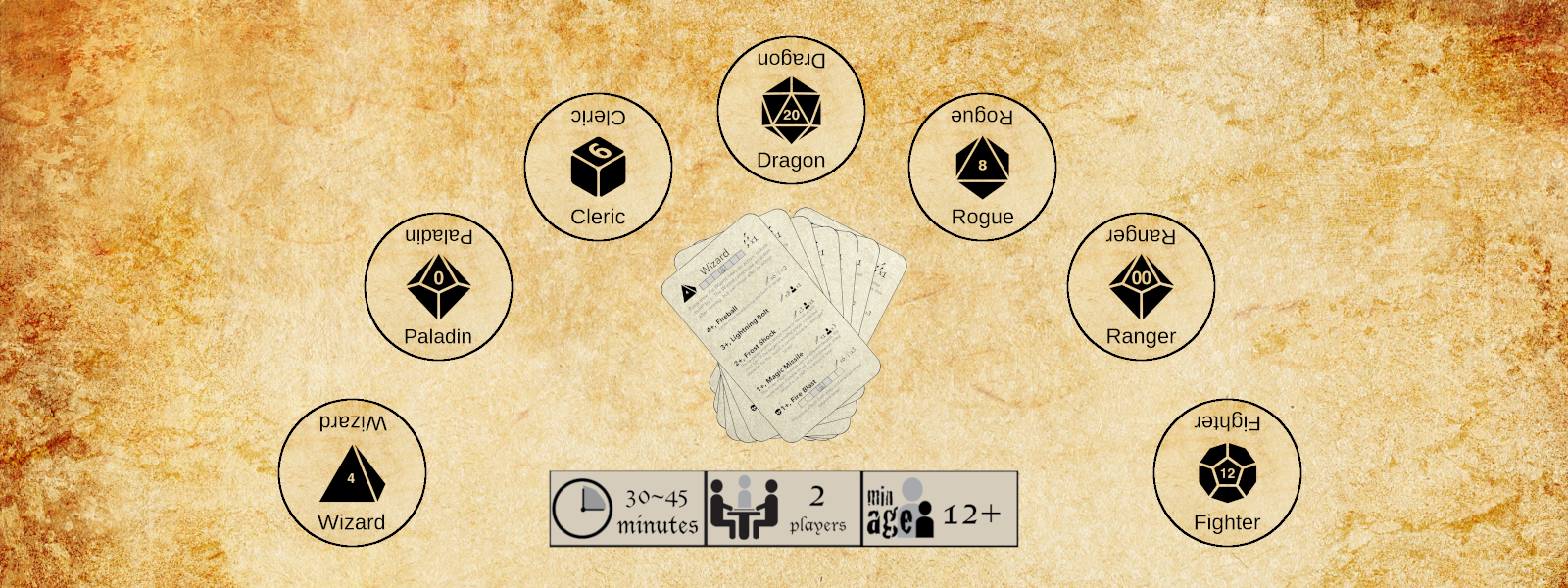 Players control a party of adventurers, each of which is unique and useful in different situations. Their three to five abilities are given on a card, and their position on a simple linear track is marked with a token. A die placed on this token marks the character's hitpoints, which also control which of those abilities is available for use. In each round of play, each player selects a character in turn and then gets to use that chosen character, again in turn. This means the first player gets freedom of action, but the second gets more information to work with.