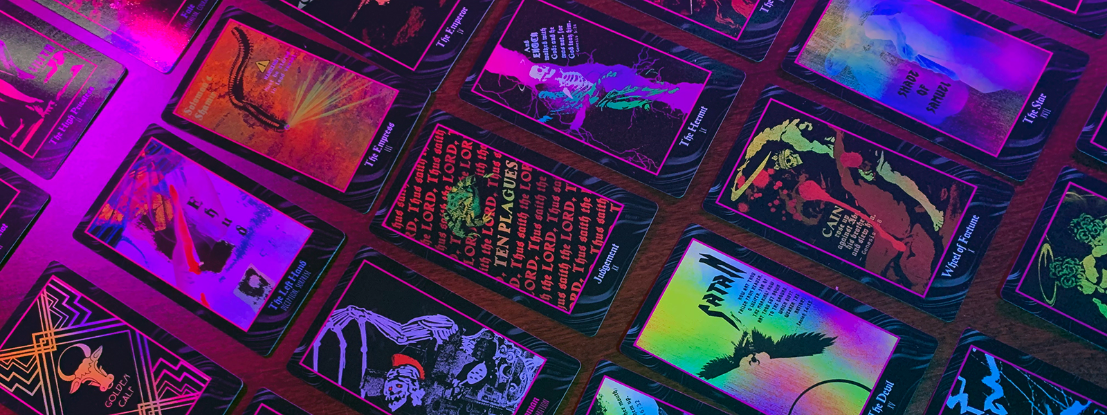 The Heavenly Thunder Tarot & Oracle (non-foil edition) is a Majors only Tarot deck (with 8x extra oracles!) themed around the legendary stories of the Hebrew Bible. Featuring the digital collage work and original drawings of contemporary graphic artist Justonky.