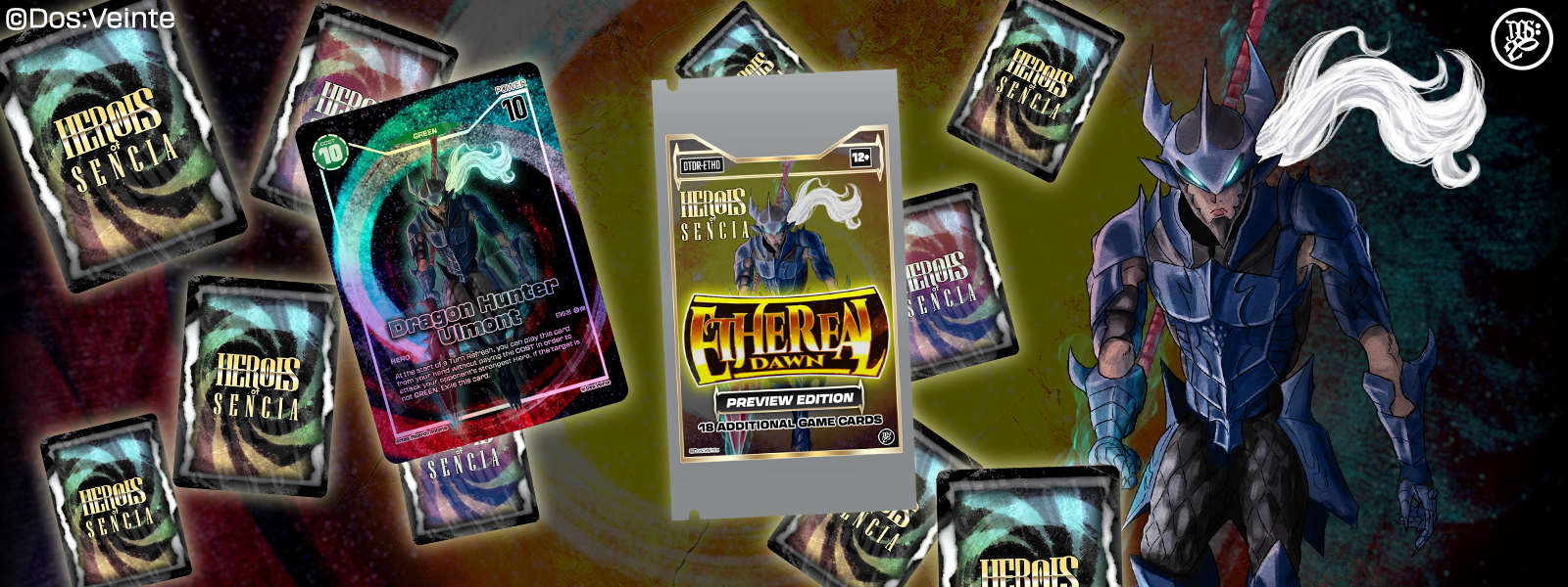 HEROES OF SENCIA is themed after the many works of Dos:Veinte! Characters throughout all the many worlds, including Seven Skies, Boneyard, and more, are featured in this card game! Collecting various characters and illustrated representations of these worlds is one enjoyable aspect, but at the heart of it are epic battles in this massive crossover experience!