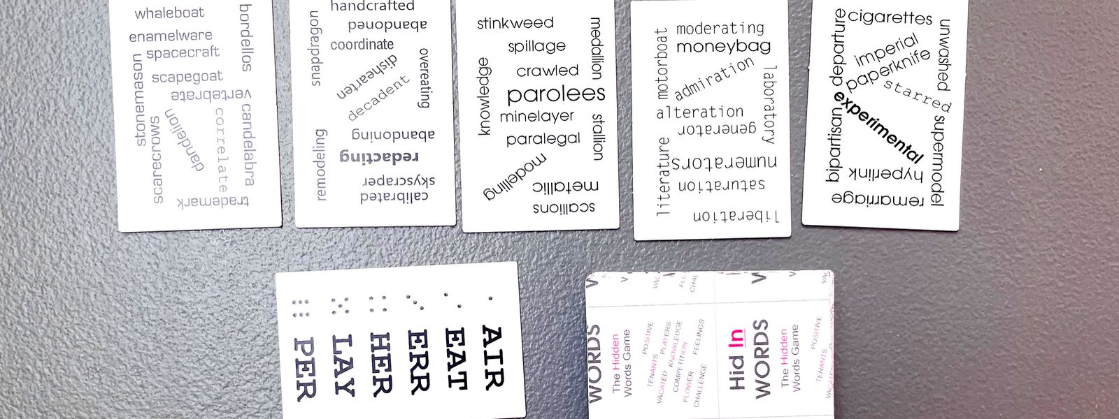 HID IN WORDS is a fast-paced word search game for two to six players, ages 12 and up. There are two game modes: