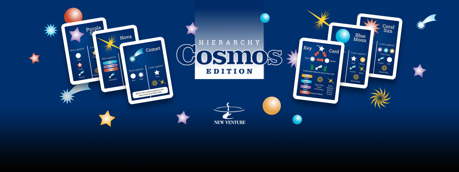 In Cosmos - the first edition of the Hierarchy game series - two players are blind-bidding to win tricks using a deck of 16 cards and a "rock-paper-scissors" ranking. But there's more! Color matters, and the comets and nova have unique ranks as well. Then, of course, there's the ominous Black Hole that beats everything. Fun, quick, and exciting!