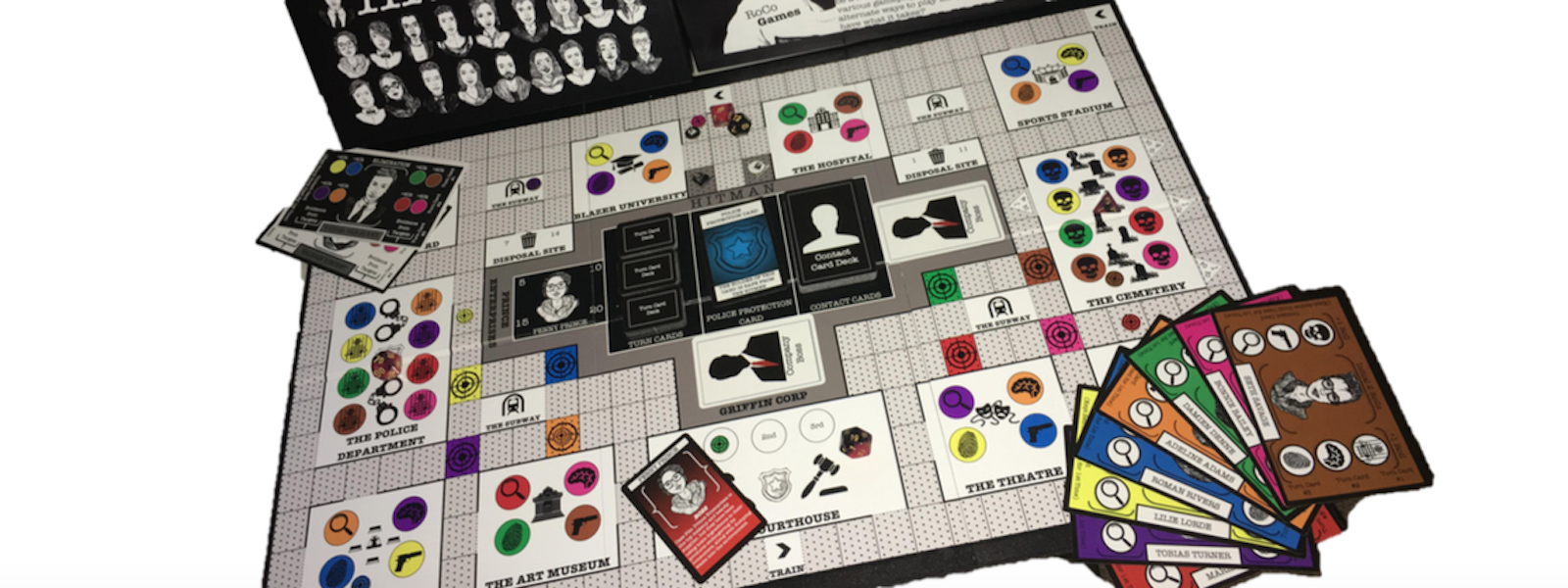 Hitman is a board game that Roman Meilinger created for his senior project at Greer Middle College Charter High School. It is a game of strategy and chase between players that combines multiple popular gameplay mechanics to keep the game interesting and different with every game played. Players may choose to play as either a hitman or a target, which will determine their goals in the game. Targets aim to take down the criminal bosses that have caused corruption in Blazer City by collecting the required evidence that has been scattered across the map. However, these bosses have hired hitmen who aim to eliminate and prevent the targets from prosecuting the companies, so they can collect their paychecks. There are two different ways to play the game. In Hitman Elimination, targets can be removed from the game if they lose too many fights with the hitmen, therefore being eliminated. In Hitman Robbery, hitmen can steal the evidence that targets have collected, and once they have collected each type of evidence, they can win the game by destroying evidence at disposal sites. Each player has contacts that will grant them unique abilities to help them win the game. The game doesn't end until all three bosses are behind bars, or all the targets have been dealt with along with the evidence.