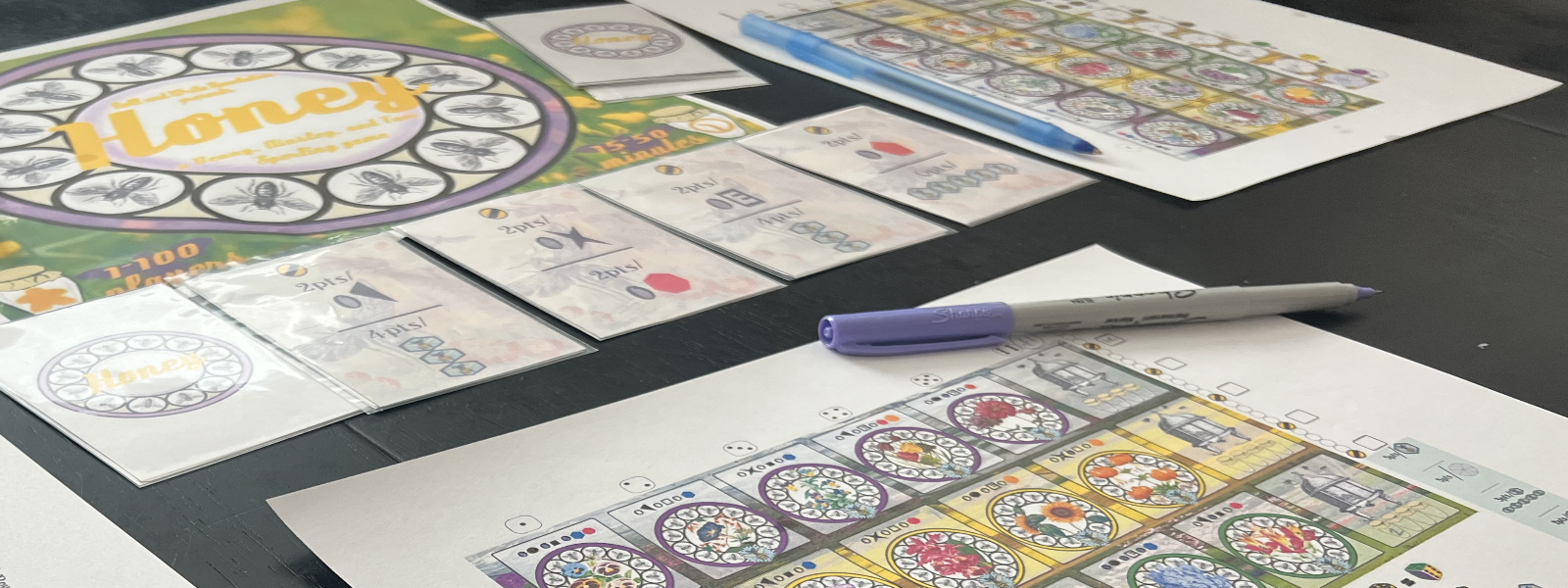 Honey plays solo or as many players as desired as long as the players all have a sheet and a writing utensil and can see the dice in 15-50 minutes. The variety of end of round cards, only 5 are used per game, will give the players plenty of choice in future games as well as order they are revealed.