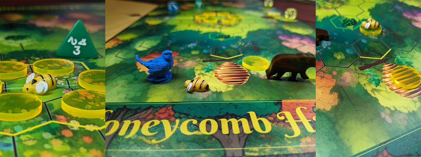 Place 9 honey tokens in the garden in the center of the board. Place the Bear token at the brown hexagon and the Bird token at the blue hexagon. Each player takes two bees to place in their perspective beehive. The four dice are set at the side of the table.