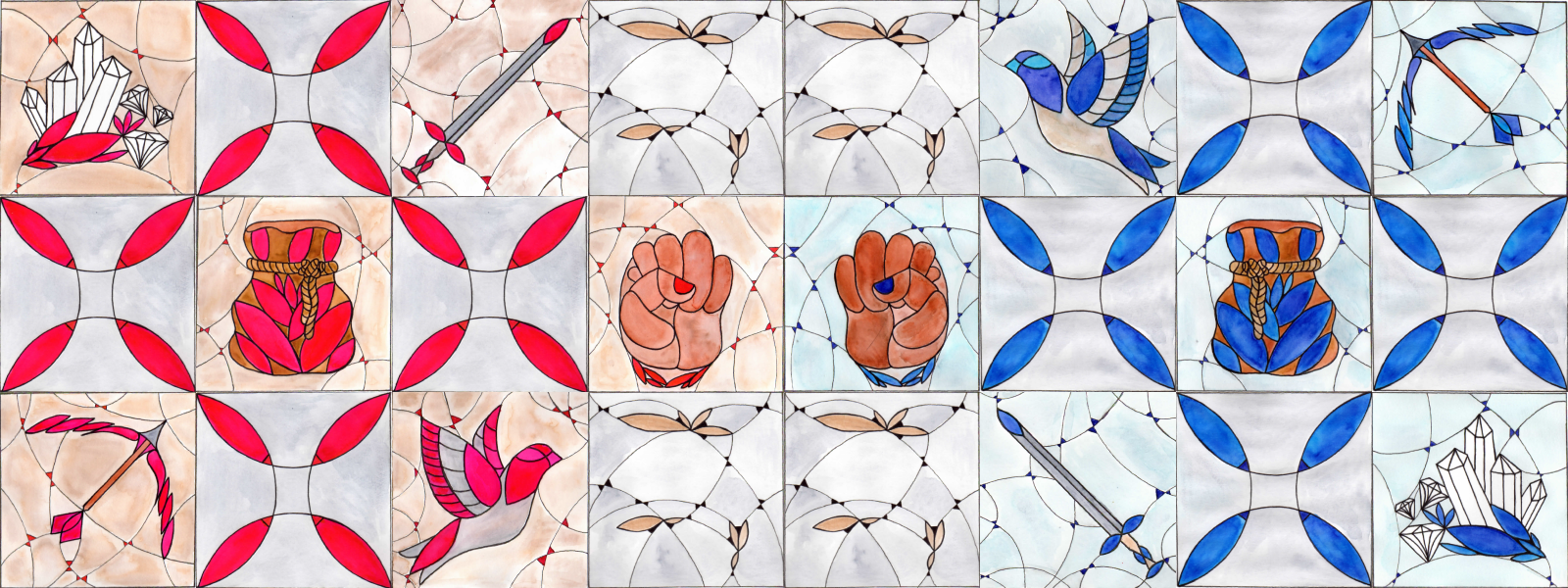 In Hoodwink, tiles are split up into three colors, red, blue, and grey. Players hide their five thieves alongside blank tiles face-down to obscure their stratagems from their rival. So long as a tile remains face-down, it can be moved by either player freely. Think you know what your opponent is plotting? Send their tile off course!