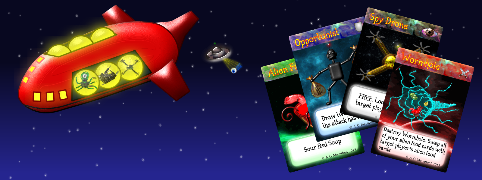 A fast, fun, family-friendly card game about intergalactic food collectors looking for Alien Food!
