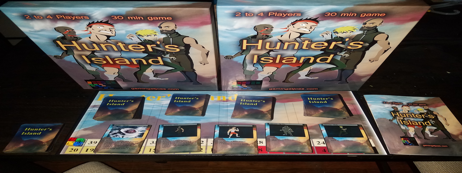 Hunter's Island is a last man standing action adventure card game. Use your turns to acquire weapons and gear to combat the other hunters on the island. While you are gathering the others are also, be vigilant are you might just be caught unprepared, move too quickly and you might just get eaten by creatures that lurk in the island.