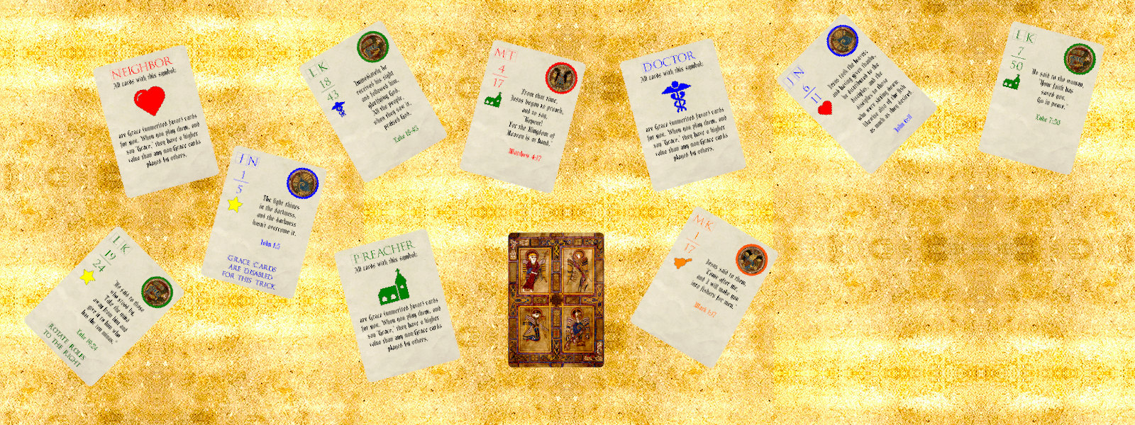 The Biblical twist to the game is that instead of “trump” cards that are the same for all players, each player takes on a role at the beginning of the game which corresponds with what we see in the gospel accounts (doctor, neighbor, preacher, teacher). Cards that match that role (that have a matching symbol) are “grace” (unmerited favor) cards only for that player. Four special cards in the deck can also disrupt the normal rules of play, making it more challenging for players to make their bid.