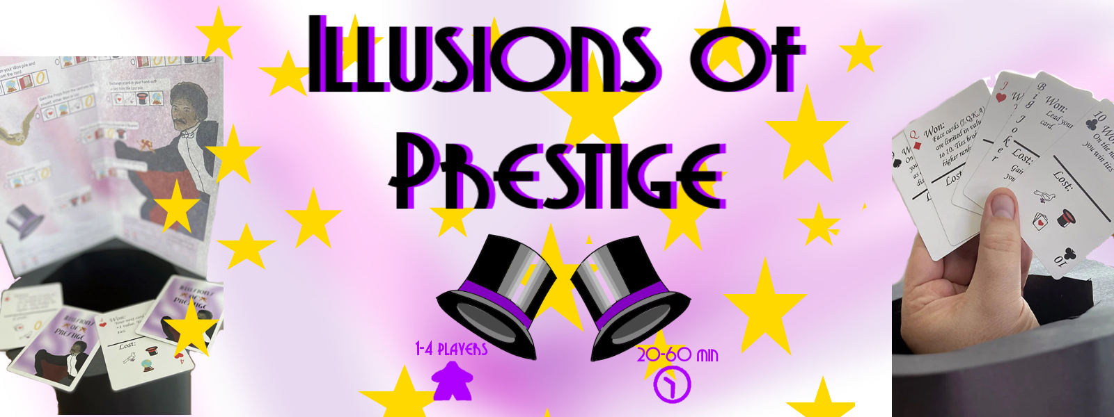 Illusions of Prestige is designed to play great with 1, 2, 3, and 4 players. The 2 player game features rules for "drafting" hands for more balanced play. The solitaire game finds the player facing off against a dreaded master of illusions who will lead by dealing TWO cards to challenge you or cycle his deck to find a suit that matches yours.