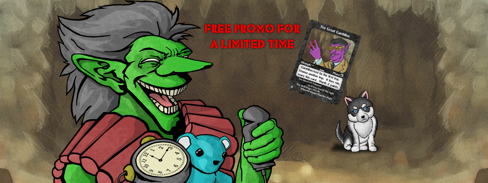 Imps Vs. Puppies is a character driven trick taking game in which players send their strongest, or most clever Imp to smash the crate. The chances are good there is a puppy inside but on occasion, it's a bomb. Not just any bomb, the kind of bomb that could blow away an Imp in a single blast, which is a tough thing to do, let me tell you. Of course it isn't all about smashing puppies as some Imps even kill others. As the crates run out, the winner is the team who managed to smash the most puppies, kill the most Imps, or even defused the most crate bombs.