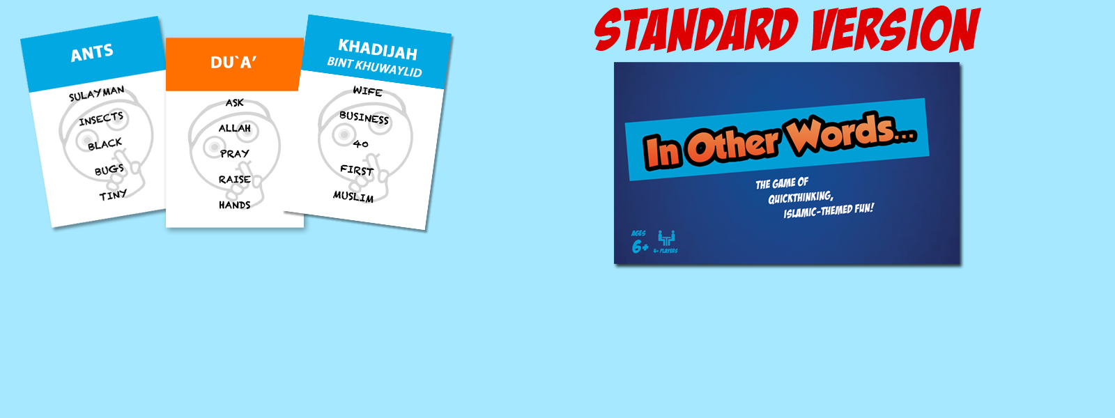 Adult and kid tested, "In Other Words... is an essential game to have. Get one for your friends, neighbors, local Islamic schools, or MSAs!