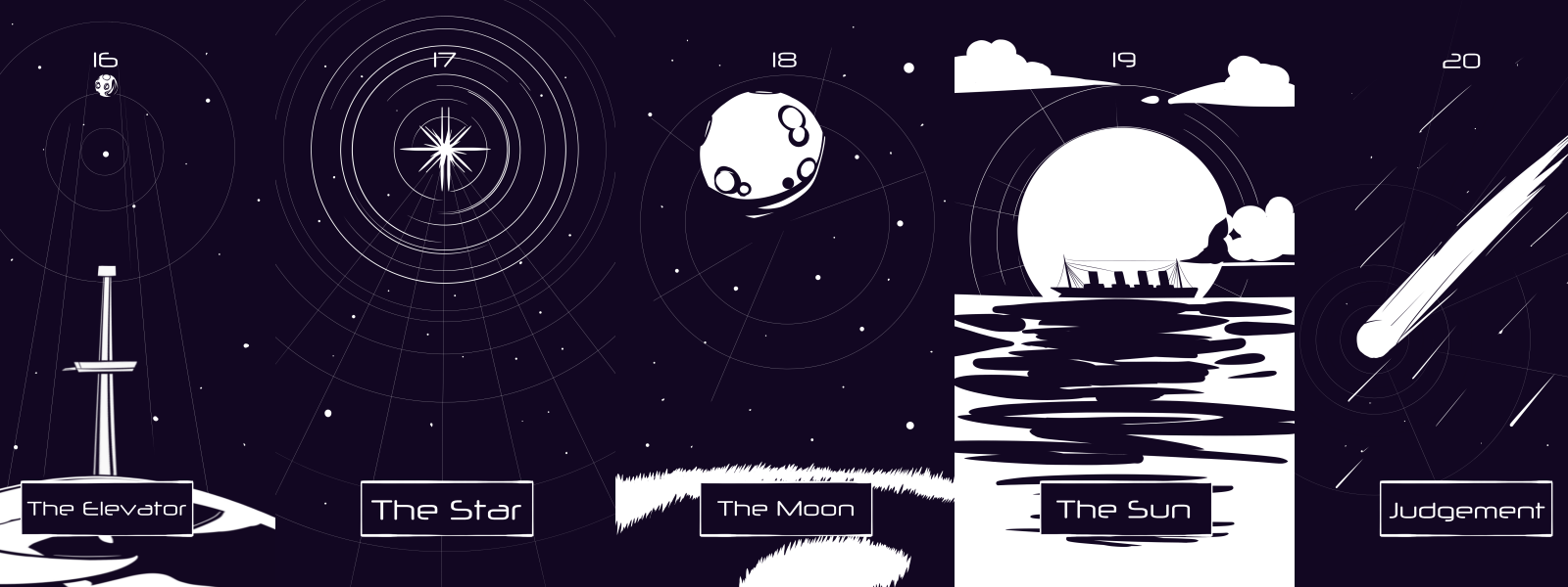 With striking white figures against the deep purple of space, the Interstellar Tarot is a testament to the fine arts, the arcane, and the scientific. Inspired by the concept of minimalism, as well as modern sci-fi media, the Interstellar Tarot tells the story of the Hermit, a lonely character who fails to make peace with his past in the empty middens we call space.