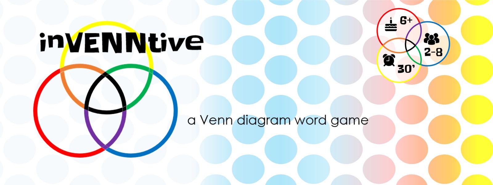 Overview: inVENNtive is a cooperative word game for 2-8 people (but you can always play with more, a party is a party!). Guide your fellow players to identify your key words by placing Adjective cards into the Venn diagram. Score points when you reveal matching words, and get bonus points for matching the inVENNtor!