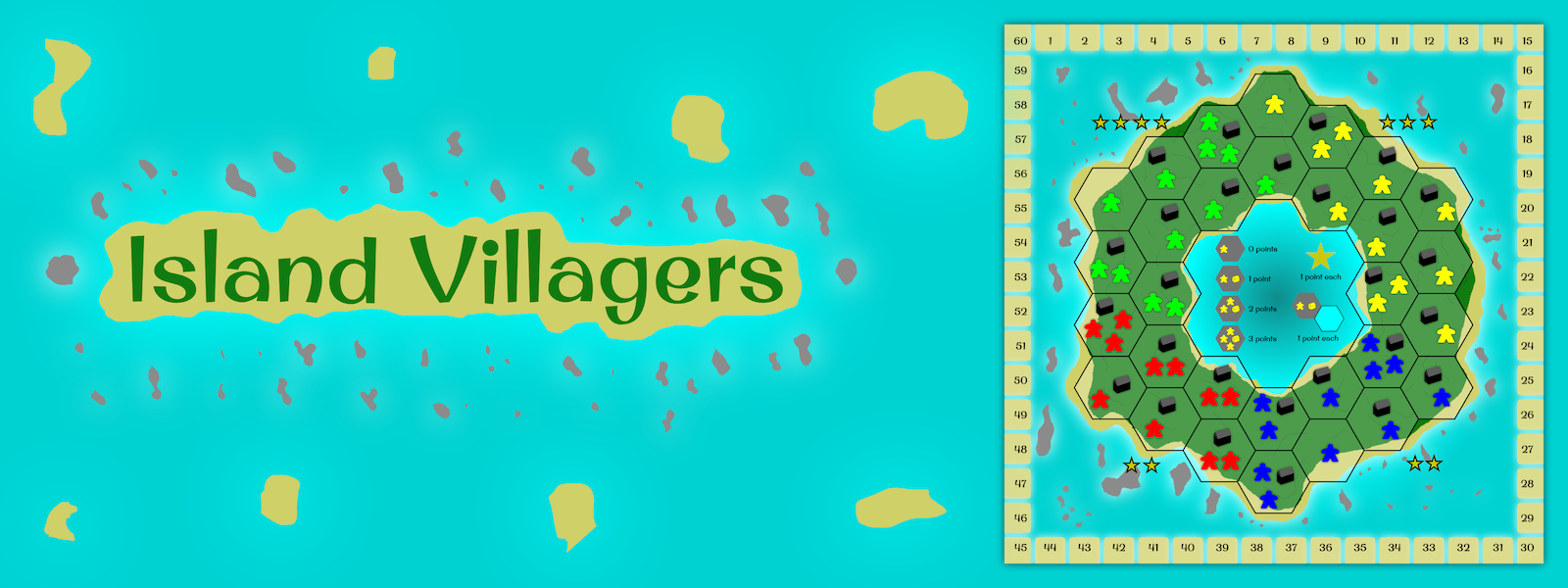 Island Villagers is an area-control, colonization, action-taking, combat game. The goal of the game is to score the most Colonization Points by controlling the best colony of villages. Colonization Points are scored based on: