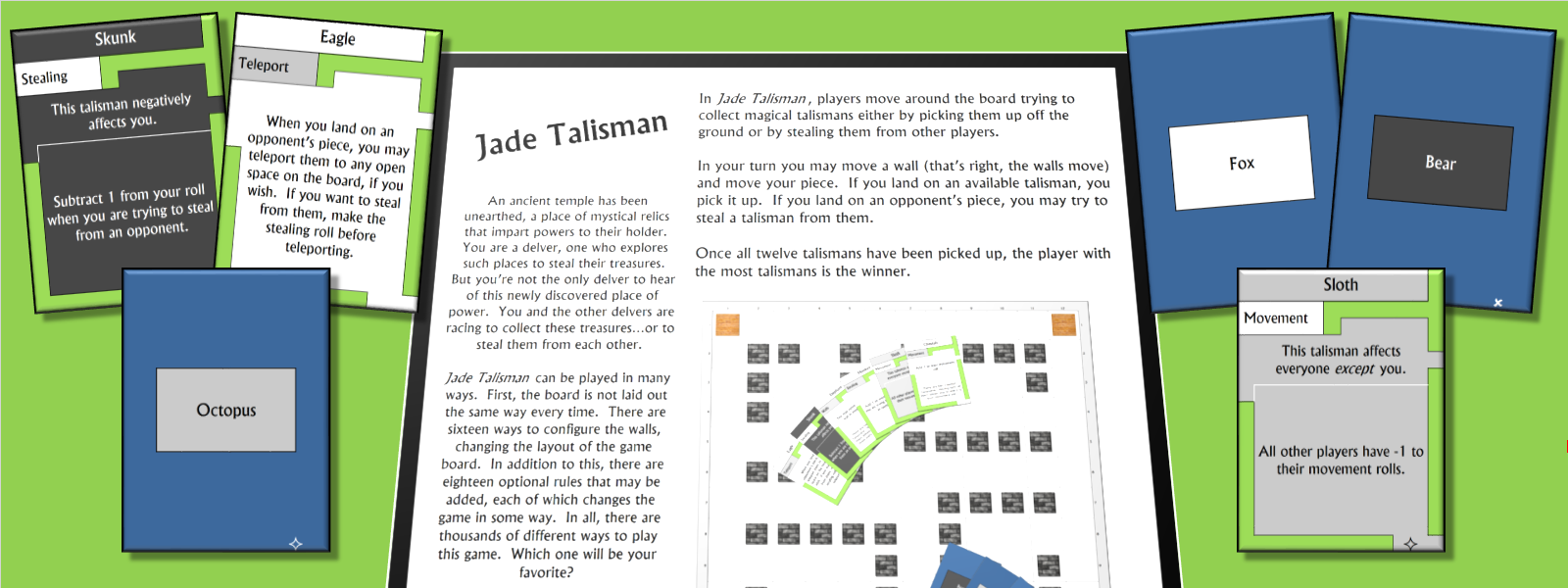 In Jade Talisman, players move around the board trying to collect magical talismans either by picking them up off the ground or by stealing them from other players.