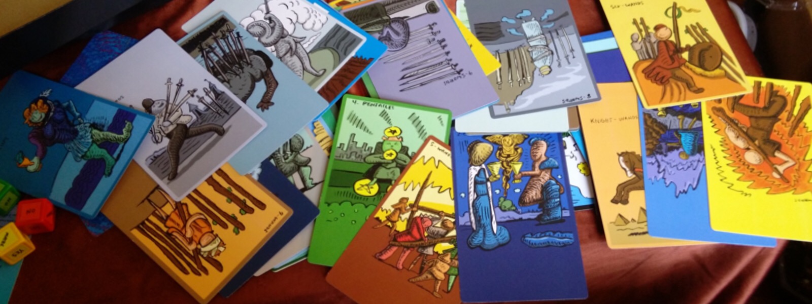 Done with ink drawings then colored on a tablet, this deck is unique and a little bit strange. Colorful and bright, each suit has a color range connected to it that should help you pinpoint the type of card right away.