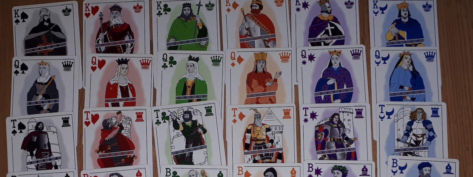 It contains the specially drawn cards for King, Queen, Tower (=Rook), Bishop, Cavalier (=Knight), Jack (=pawn) for the 6 suits of K6T: Spades, Clubs, Moons, Hearts, Diamonds, Stars.