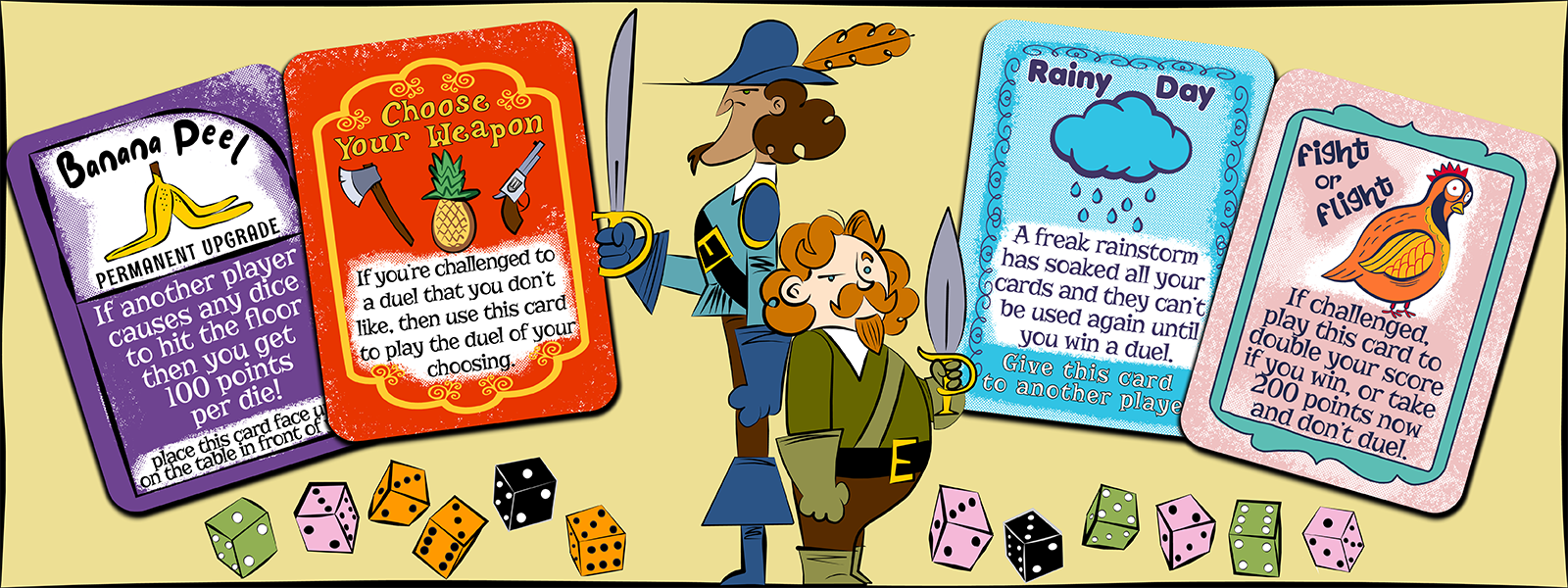 The goal of the game is simple, be the first player to earn 10,000 points. The way you gain points is by playing some of the zaniest dice and card duels you could ever imagine!