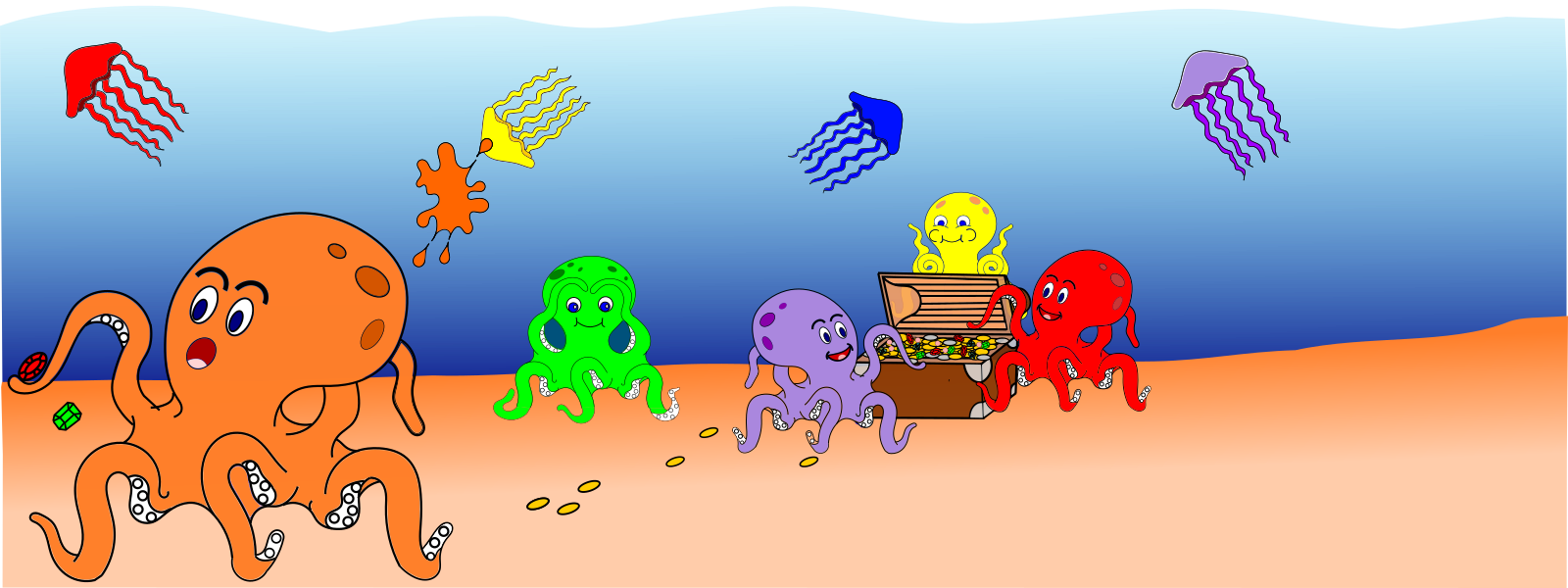 Octopi are the dragons of the sea. Just like land dragons they like to horde silver, gold, and precious gems. Join our pod as they raid a sunken pirate's treasure chest. Earn points by collecting pearls, silver pieces of 8, gold doubloons, rubies, emeralds and diamonds. Or simply race to be the first to complete your octopus' 3 arms.