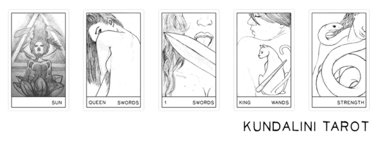 The Kundalini Tarot Deck features drawings and paintings inspired by and created under the influence of kundalini energy. WIth black and white artwork and simple labels, the cards stand out and draw your attention, encouraging you to interpret tarot meanings in a whole new way.