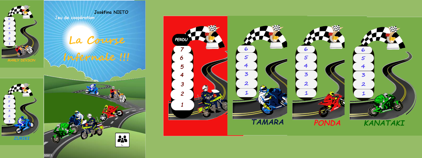 Glissez vous dans la peau d'un pilote de moto et tentez avec l'aide de vos amis de remporter la course. Lancez les dés pour faire avancer une moto en compétition et essayer d'obtenir une paire par niveau (si vous tombez sur la police, c'est ce dernier qui monte d'un niveau). Vous pouvez relancer autant de fois que vous le souhaitez mais attention aux 2 crevaisons qui vous feront rester au même niveau !!