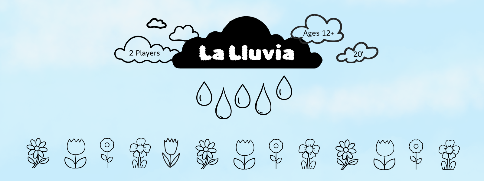 Make it rain! In La Lluvia players are competing to water the most flowers. Players take turns rolling a die and coloring raindrops. As soon as one player colors the majority of the raindrops below a cloud in their player color, they get to claim and color that cloud. Some clouds offer bonus actions. Each column of clouds waters one flower. The player who claims the majority of the clouds in that row successfully waters the flower and colors it in their player color. The game ends as soon as one player waters 3 flowers. That player is the winner!