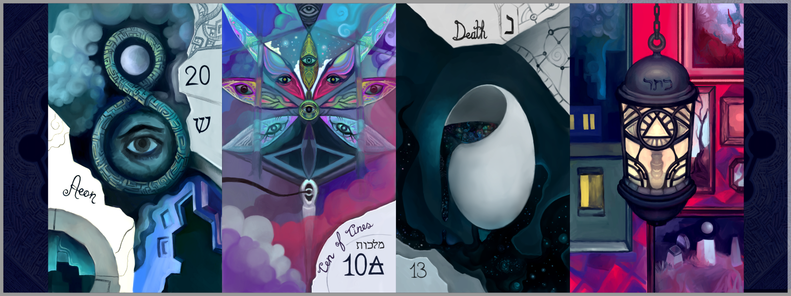 The Lacuna Tarot is a unique, symbolically rich, surrealist, gender-neutral deck of Tarot cards designed, painted, and developed by visual artist Aleks Samoylov (yours truly). While it is standard in structure (with 22 Major Arcana and 56 Minor Arcana cards) the imagery is not based on any existing systems (such as the Marseilles, Rider Waite Smith, and Thoth decks) and was instead developed out of whole cloth, so to speak. The illustrations are largely based in my personal and intuitive interpretation of the Tarot, with special attention paid to the Kabbalistic and Hermetic understanding of the cards, trumps, and suits (which is key to how I personally prefer to read).