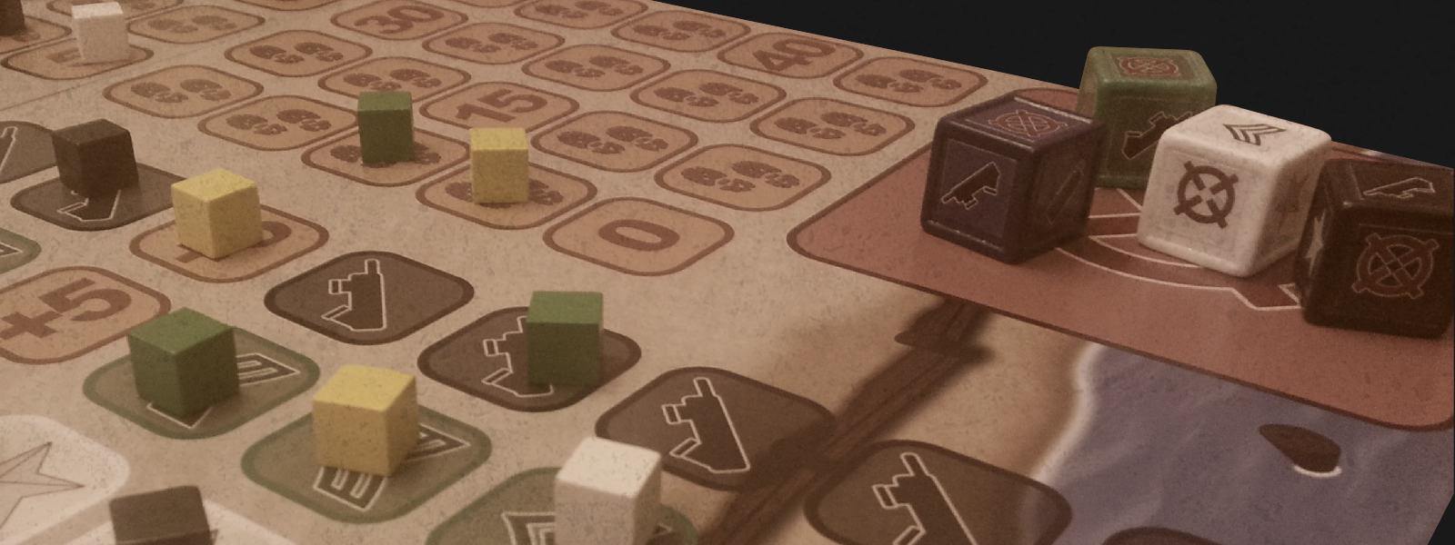 Leathernecks ‘43 is a fast-paced dice game which mixes push-your-luck elements with important tactical decisions. You control a squad of Marines advancing up the beach towards enemy machine gun positions. Rolling the soldiers on your dice allows them to advance, but you might also roll machine gun fire which slows them down. Each suppressing fire result pins down one of your soldier dice and if you accumulate three suppressing fires in a single turn, your entire squad is pinned down and none of your soldiers advance! If you’re lucky, you can use smoke grenades to avoid the fire and push your squad up the beach. Your goal is to assault the bunker, but you also need to outpace your opponent’s soldiers! At the end of the game, you score bonus points if you moved your different soldiers farther than your opponents, so you need to pay attention to what they are doing!