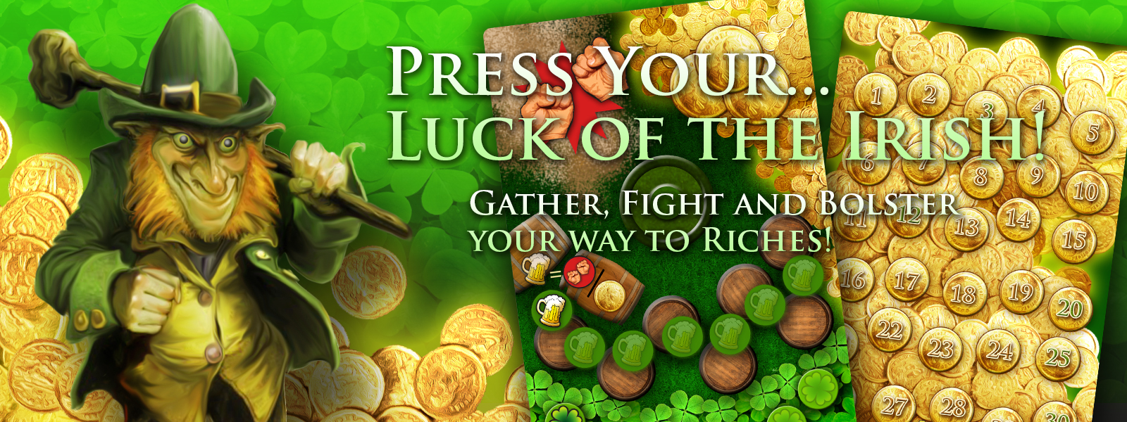 Leprechaun is an all out battle for gold. It's a dice rolling game with a bit of press your luck. Players represent Leprechauns gathering gold coins, fighting over gold coins, and bolstering by drinking beer and gathering 4 leaf clovers.
