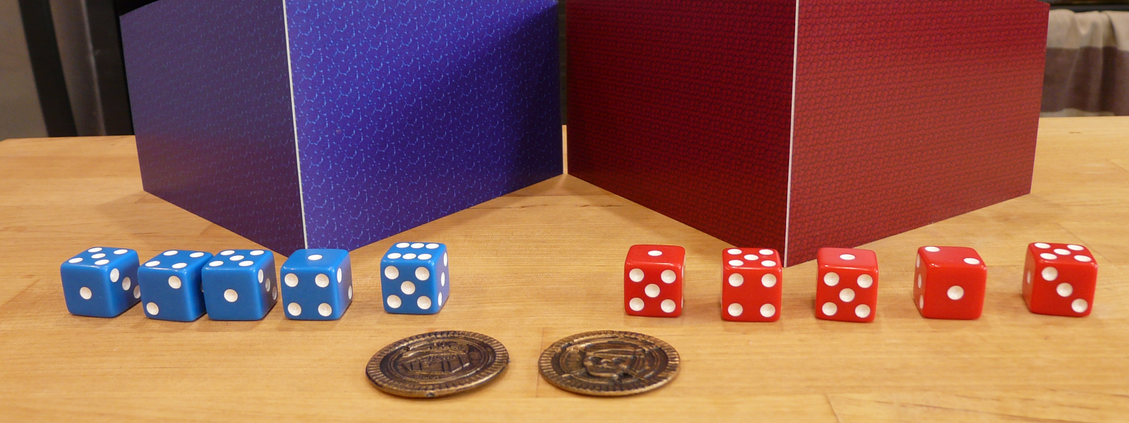 In Liar's Dice each player starts the game with five dice and a screen. Everyone rolls their dice for the round at the same time and play begins. A turn consists of placing a bid or challenging the last bid. Bids represent a claim to how many dice of a given value are in the game. When a bid is challenged, the loser must give up a die. The last player with dice left wins.