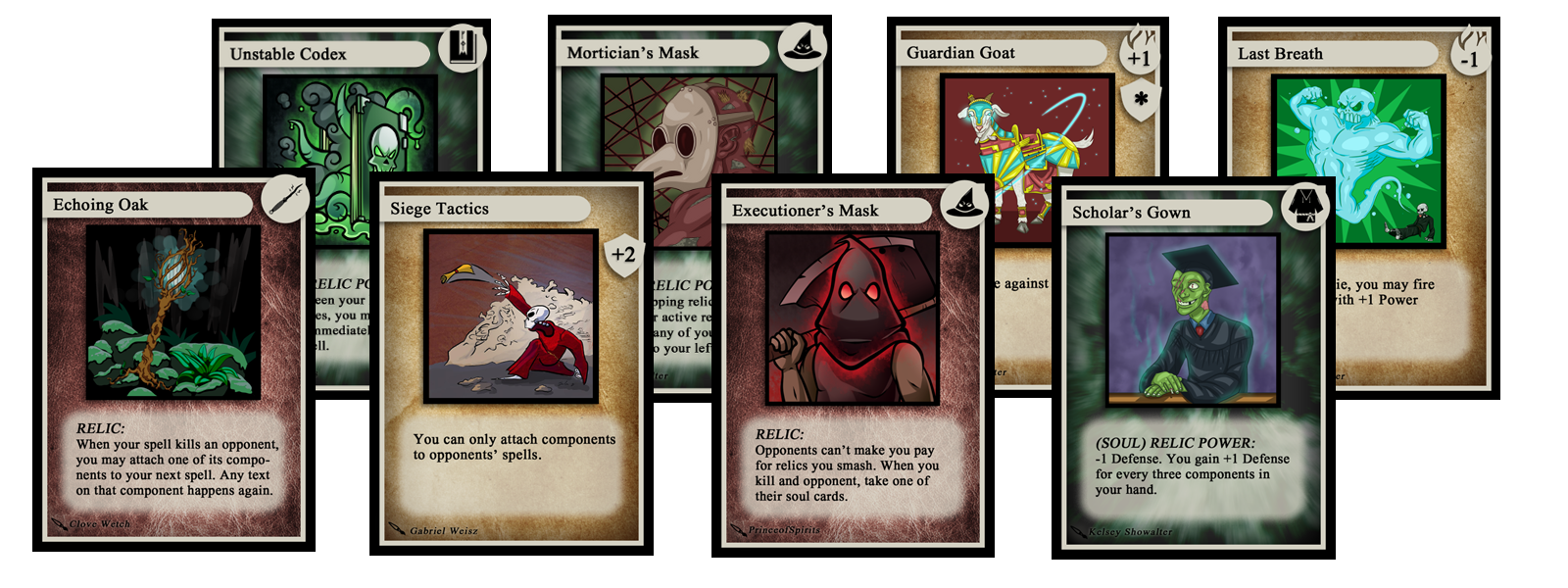 Lich party is a card game for 3 to 5 players. Each player is Lich, and has placed their soul in a magic relic. While this relic is intact, a Lich is immortal – this is their phylactery. But, after a few thousand years of immortality, even the strongest of Liches can get bored. To cure their boredom, they throw the deadliest of parties. A pile of relics is created, in which lie the phylacteries of all the attending Liches. Using scrying magic, a Lich can figure out which relics contain their opponent’s souls. Quickly, the party turns from fun to deadly as crazy, haphazard spells are hurled and relics are destroyed.