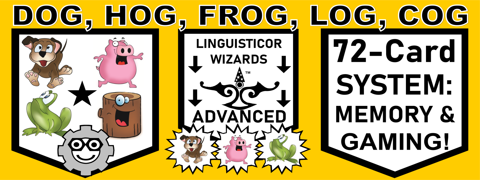 Linguisticor Wizards Advanced System is a 72-card MEMORY SYSTEM GAME used in the METAPHYSICAL MEMORY QUEST GAME SERIES. Each LWA game features a five-character paradigm. In this version: DOG HOG FROG LOG COG.