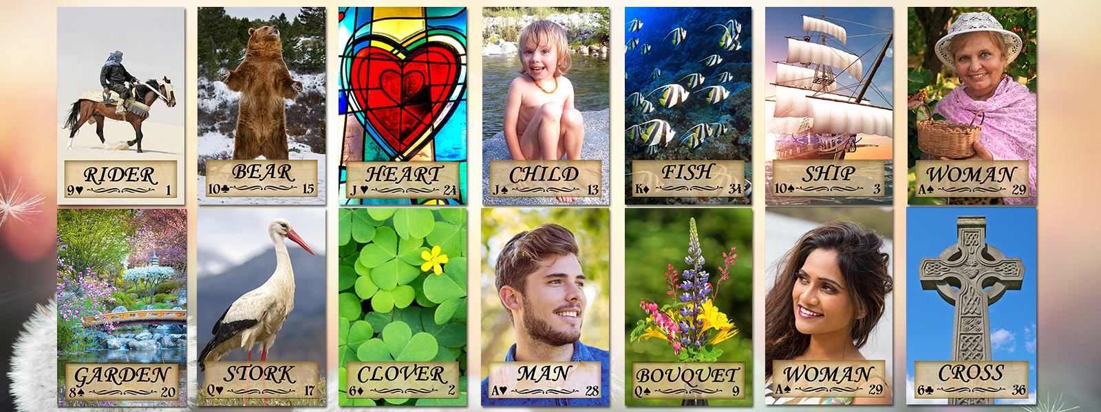 Each of the 36 cards has meanings associated with it. You read the cards together, adding their meanings to make a sentence. It's kind of like creating a story or playing a game. You can get very practical answers for questions such as "Is he cheating on me?" "When will I find a new job?" etc. They can also be esoteric, but lean towards regular life practical answers. The system get's it's name from a famous french fortune teller of the aristocrats, Mlle Lenormand.
