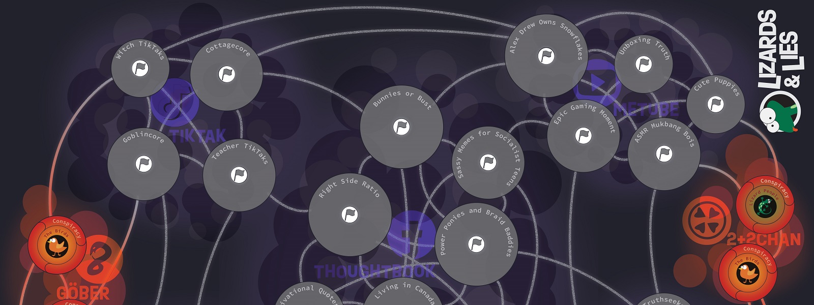 Lizards and Lies is a board game designed to model and create discussion about the spread of conspiracy theories on social media networks. Players take the role of either a Spreader (Conspiracy theorists and Edgelords) or a Stopper (Content Moderators and Digital Literacy Educators) with the goal of spreading ridiculous theories or trying to stop them from gaining ground. Through play, participants will see how conspiracy interacts with a national election to grow, engage with algorithms, and spread lies. Players take the role of characters in a social media network to create chaos or stop it from happening in and forth team based play.