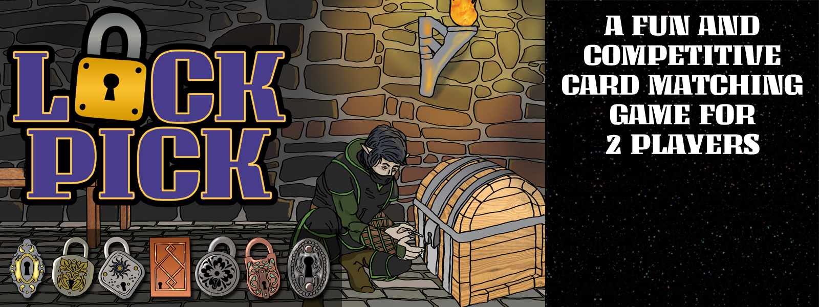 Lock Pick is a card matching game where two players compete to be the firs to match picks to a series of locks. Both the picks and the locks are on playing cards and the game is played on a full color game mat. See the Action Shots below for examples of LOCK PICK cards and the LOCK PICK game mat.